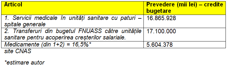 Estimez că un procent de 16,5% reprezintă cheltuielile cu medicamente din serviciile medicale în unităţi cu paturi de 32.018.024 (mil. Lei), adică 5.282.974 (mil.lei) = 1,06 mld. euro (1 Euro = 4,9746 lei în anul 2024 la cursul BNR= Banca Națională a Romăniei)