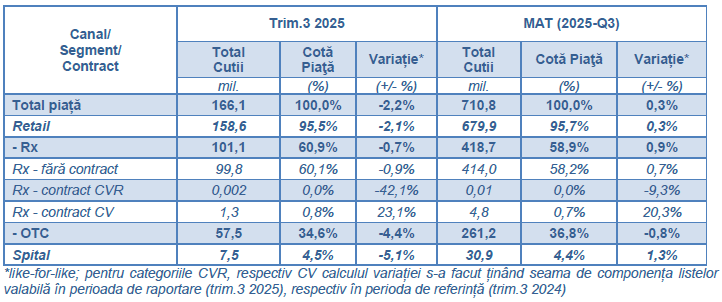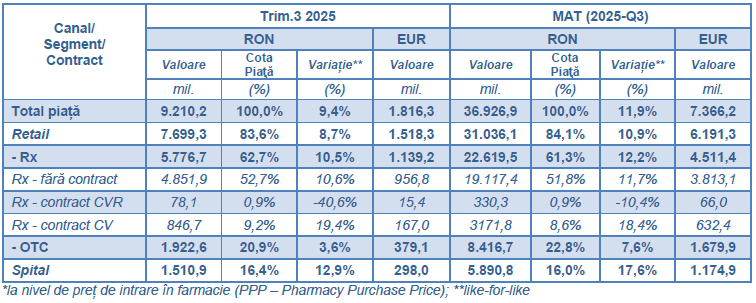 În trimestrul 3 2025, valoarea totală a medicamentelor eliberate către pacienți s-a ridicat la 9,2 miliarde lei în creștere cu 9,4% față de trimestrul 3 din 2024, în condițiile în care medicamentele din retail au crescut cu 8,7% iar cele consumate în spitale cu 12,9%. În canalul de retail, pe segmente, ratele de creștere în lei au fost de 10,5% pentru Rx şi de 3,6% pentru produsele fără prescripție medicală. Medicamentele pe bază de prescripție din farmaciile de retail, altele decât cele cuprinse in contractele cost-volum sau cost-volum-rezultat, au înregistrat un avans de 10,6% față de trimestrul 3 din 2024. În perioada octombrie 2024 – septembrie 2025, valoarea totală a pieţei a fost de 36,9 miliarde lei în creștere cu 11,9% faţă de perioada de referință. Medicamentele pe bază de rețetă (Rx) din farmacii au atins 22,6 miliarde lei (+12,2%), produsele fără prescripție medicală din farmacii au însumat 8,4 miliarde lei (+7,6%) iar segmentul de spital 5,9 miliarde lei (+17,6%). Izolând impactul semnificativ al programelor cost-volum-rezultat (CVR) și cost-volum (CV) din retail, ce totalizează cca. 3,5 miliarde lei, piața de medicamente Rx fără CVR/CV, din farmacii a crescut față de perioada de referință cu 11,7%, la valoarea de 19,11 miliarde lei (3,81 miliarde Euro).