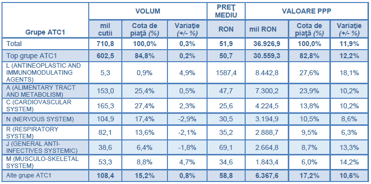 Tratamentele destinate patologiilor sistemului nervos au scăzut ca volum cu 2,9%, cele destinate sistemului respirator cu 2,1%, în timp ce anti-infecțioasele sistemice au scăzut cu 1,8%. În valoare, în ultimele 12 luni se evidențiază creșteri peste media pieței de 11,9%, în cazul antineoplazicelor și imunomodulatoarelor (+18,1%), al medicamentelor destinate sistemului musculo-scheletic (+14,2%) și al anti-infecțioaselor sistemice (+13,3%). Toate celelalte grupe terapeutice au avut creșteri semnificative, dar s-au situat sub media pieței. Astfel medicamentele pentru sistemul digestiv și metabolism precum și cele pentru sistemul cardiovascular au crescut cu 10,2%, cele destinate sistemului nervos cu 8,6%, iar cele pentru afectiuni ale sistemului respirator cu 6,3%.