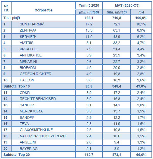 În volume, în trimestrul 3 2025 clasamentul primilor trei se păstrează același ca în trimestrul anterior, cu compania Sun Pharma (inclusiv Terapia) pe primul loc, cu un consum de 17,2 mil. unități, fiind urmată de Zentiva (inclusiv Labormed și Alvogen) cu 15,3 mil. unități și de Servier (inclusiv Egis) cu 11,0 mil. unități. Nici pentru intervalul octombrie 2024 – septembrie 2025, componența principalelor 10 corporaţii nu se modifică în comparație cu ediția anterioară. Astfel, pe primul loc se află corporația Sun Pharma cu 72,1 mil. unități urmată de Zentiva cu vânzări de 63,1 mil. unități și Servier cu 43,9 mil. unități. Topul primilor 10 jucători este completat de Viatris (33,2 mil. unități), Krka (31,4 mil. unități), Antibiotice (23,9 mil. unități), Menarini (22,7 mil. unități), Biofarm (20,0 mil. unități), Gedeon Richter (19,8 mil. unități) și Haleon (18,3 mil. unități).