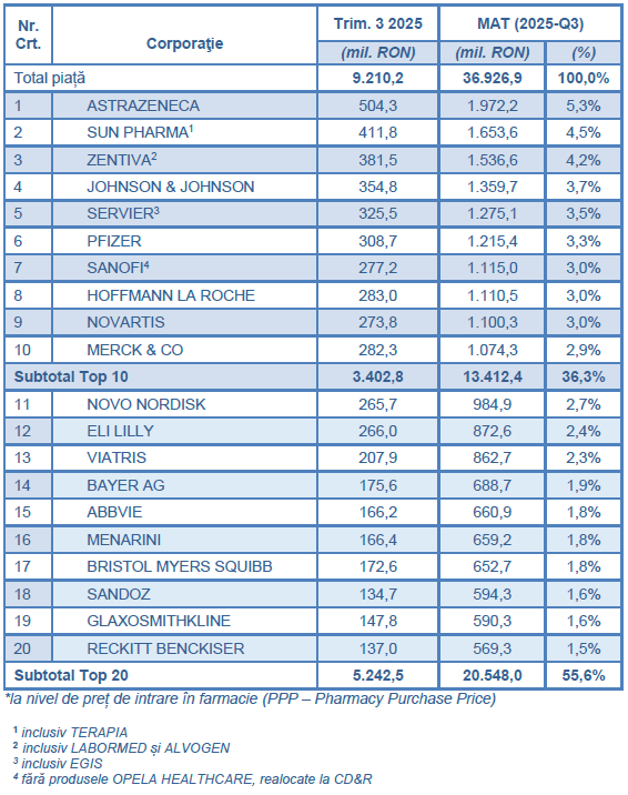 În valoare, în trimestrul 3 2025 ierarhia primelor 3 corporații din punct de vedere valoric nu se modifică, compania AstraZeneca rămânând pe primul loc cu 504,3 mil. lei, fiind urmată de SunPharma (inclusiv Terapia) cu 411,8 mil. lei și de Zentiva (inclusiv Labormed și Alvogen) cu 381,5 mil. lei. Nici pentru intervalul octombrie 2024 – septembrie 2025, ierarhia primelor 3 corporații din punct de vedere valoric nu se modifică față de trimestrul anterior. Astfel, pe primul loc se situează corporația AstraZeneca cu vânzări de 1.972,2 mil. lei, urmată de Sun Pharma cu 1.653,6 mil. lei și de Zentiva cu 1.536,6 mil. lei. Topul primilor 10 jucători este completat de Johnson&Jonhnson cu 1.359,7 mil. lei, Servier cu 1.275,1 mil. lei, Pfizer cu 1.215,4 mil. lei, Sanofi (1.115,0 mil. lei), Hoffmann La Roche (1.110,5 mil. lei), Novartis cu 1.100,3 mil. lei, urmată de Merck &Co (1.074,3 mil. lei).